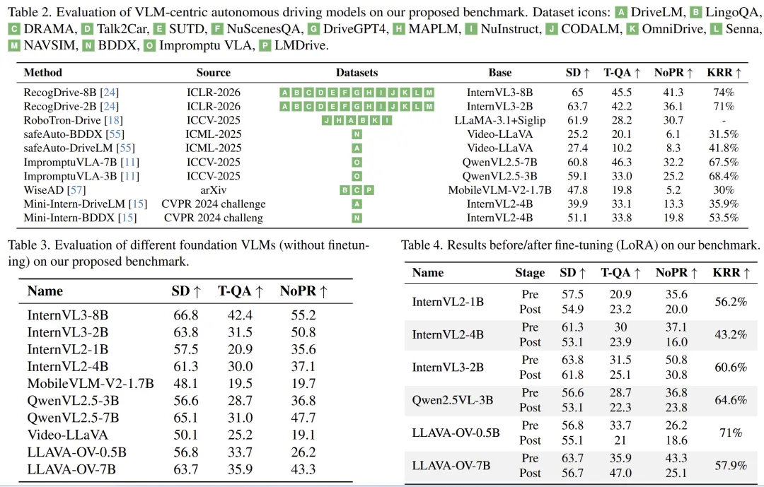 论文在 表2 中评测了多个已有自动驾驶VLM模型,如 RecogDrive、ImpromptuVLA、safeAuto、WiseAD 等。整体结果表明,这些模型虽然在场景描述(SD)和交通问答(T-QA)上取得一定成绩,但在 NoPR 和 KRR 上普遍不理想,说明微调后不同程度地损失了原有感知知识。