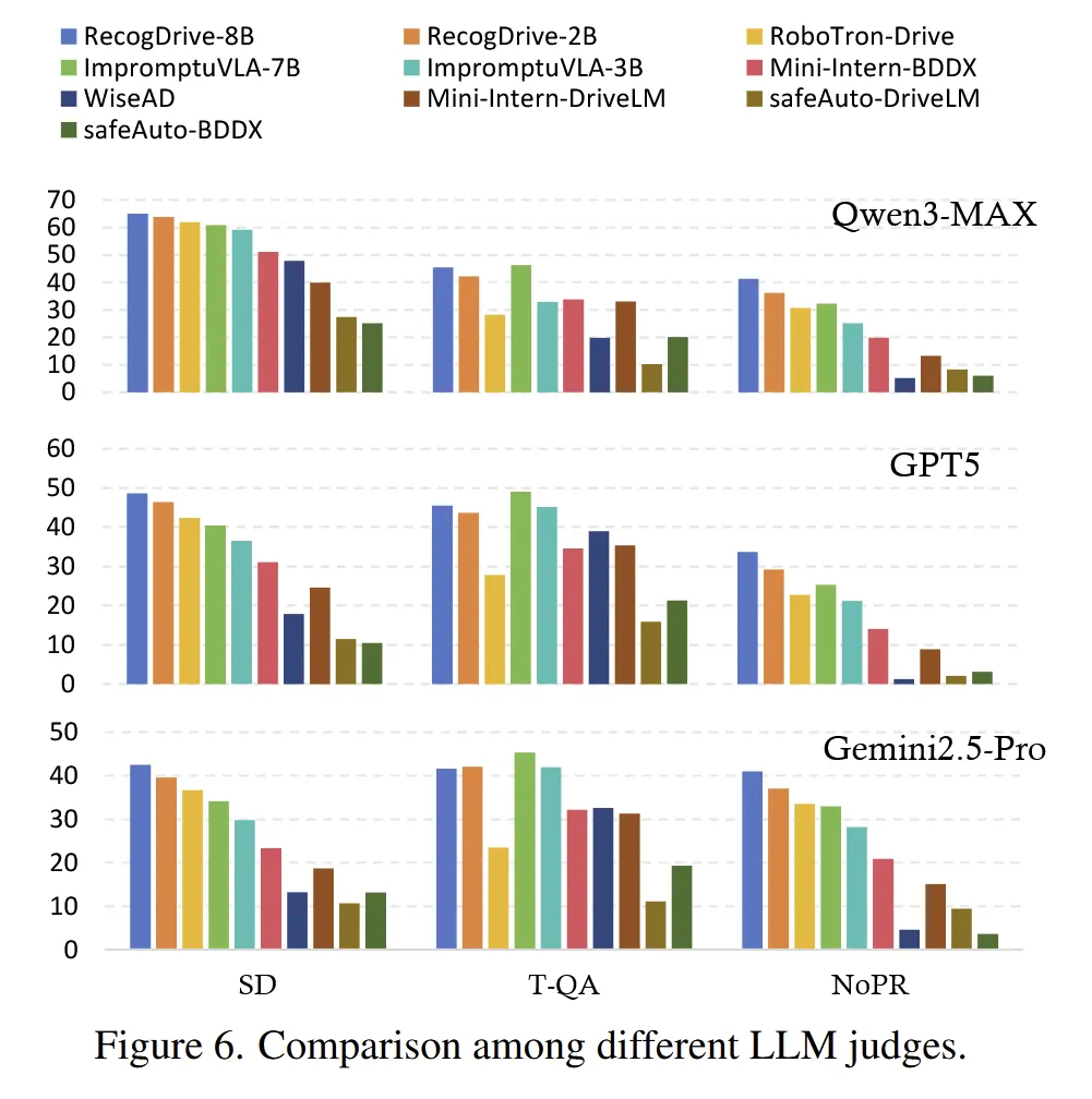 作者还在图6中比较了不同大模型裁判(Qwen3-Max、GPT-5、Gemini-2.5-Pro)的评估结果。不同 judge 下各方法的排序基本一致,说明这个评测框架的结论不是偶然由某个裁判模型偏好造成的,而是比较稳健。