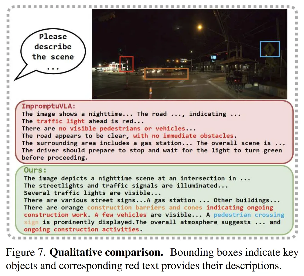 在图7中,作者给出夜间路口样例。DEA 能识别施工区域、交通风险和多个关键物体,而 ImpromptuVLA 漏掉了这些要素,甚至错误认为前方没有障碍。这种差异很能说明问题:DEA 不仅指标更好,而且在安全关键场景下,感知更细粒度、更可靠。