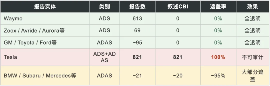 ADAS则呈现分裂格局:GM的报告质量堪比ADS阵营,提供了EDR时间线和OnStar录音;Toyota、Honda、Ford等传统车企也基本公开叙述;而Tesla、BMW、Subaru等选择大规模CBI遮盖。ADAS数据集的整体可用性,被CBI遮盖和Unknown字段严重拖累。