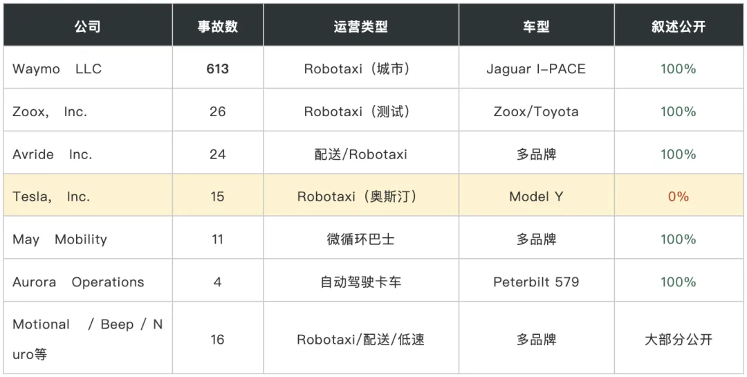 ADS公司(尤其Waymo、Zoox、Avride、Aurora)的报告质量一致地高——完整叙述、精确坐标、详细系统状态。这不仅是技术能力的体现,更反映了这些公司在公众信任是商业模式基础这一点上的共识。它们在公共道路上运营无人车辆,必须通过透明度来换取社会许可。