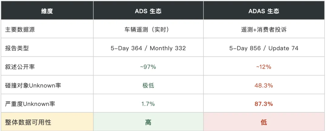 最后一个发现超越了事故本身。报告的方式、质量和完整度,本身就映射了每家公司——乃至ADS vs ADAS两个赛道——的技术和治理成熟度。
