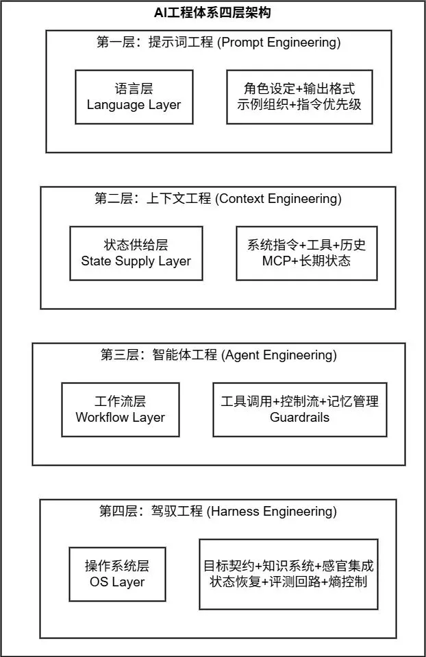 | 四层体系 | 提示词工程→上下文工程→智能体工程→驾驭工程 |