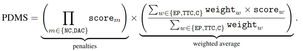 PDMS分为得分项和惩罚项,惩罚项是NC和DAC,对于和交通参与者发生碰撞,或者驶出可行驶区域,与护栏等障碍物碰撞的行为:NC(no collision),DAC (drivable area compliance), 这两项得分分别为 0,这会直接导致这一帧的 PDMS=0。与静态目标碰撞的得分0.5,得分项包括TTC(碰撞时间)、Comf(舒适度)和EP,其中TTC 用来保证自车和他车的安全距离,默认为1。Comfort:就是比较轨迹里的 acceleration 和 jerk 是否在一个提前设置的阈值范围内。EgoProgress(EP):指的是预测轨迹沿着 route center line 路由中心线行进,EP被计算后会归一化到。