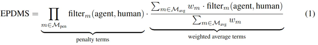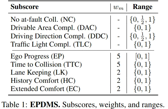 EPDMS增加了交通信号灯、驾驶方向、车道保持,细化了舒适性,同时引入过滤机制,如果在同一场景中人类专家驾驶员也实施了违反规则的行为,则忽略该惩罚。这避免了因标签噪声或有效行为而受到惩罚的违规行为,例如短暂地进入对向车道以绕过静态障碍物。