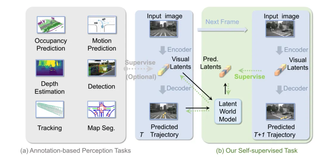 监督信号V_{t+1}来自编码器对真实未来帧的自动提取,无需人工标注。这实现了数据自举——用模型自身提取的特征监督另一分支的预测能力。驾驶规划的本质是未来状态的概率推理,而非像素完美重构。基于此,论文Enhancing End-To-End Autonomous Driving with Latent World Model提出LAtent World model (LAW),在潜空间直接预测未来特征,将自监督信号从像素域提升到语义域。这一范式的数学优雅性体现在其规避了高维图像分布建模,转而学习紧凑、动作条件化的潜动态。不生成未来图像,而是直接在潜空间预测未来特征!这消除了扩散模型那种秒级延迟的噩梦。
