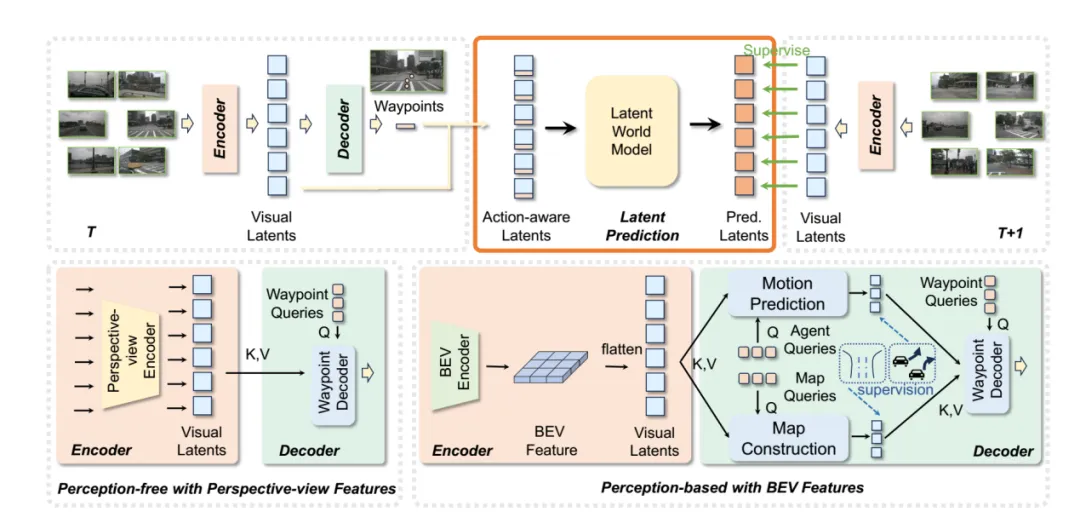 核心思路:在 latent 空间(而非像素空间)构建一个生成预测的世界模型,把这个预测和真实未来 latent 对齐,作为一个自监督任务,与轨迹监督联合训练。该任务能无缝插入两类主流端到端框架:Perception-free:直接从图像到轨迹;Perception-based:在 BEV 表示上做 detection / map segmentation / motion prediction 多任务学习。后来世界模型自动驾驶都遵循这种思路,并且研究表明免感知任务的效果远不如加入感知的,而这个感知也逐渐进化,论文World4Drive:End-to-End Autonomous Driving via Intention-aware Physical Latent World Model,感知包含了深度信息、语义信息和3D位置信息。论文WorldRDT进化为VGGT,Latent-WAM再进化为WorldMirror。