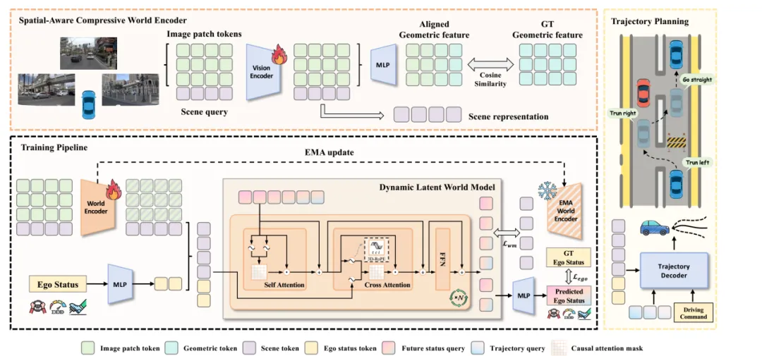 准确预测自车状态对建模世界动态至关重要。从预测的未来世界状态中提取自车状态嵌入 ,通过三个独立 MLP 解码,分别预测驾驶指令 、速度 和加速度 ,提供精确的世界状态转移引导。可学习的轨迹查询 τ 与当前世界状态表示 一同送入解码器,经轻量 MLP 解码为多条候选轨迹,根据当前驾驶指令 选择对应轨迹作为最终输出。