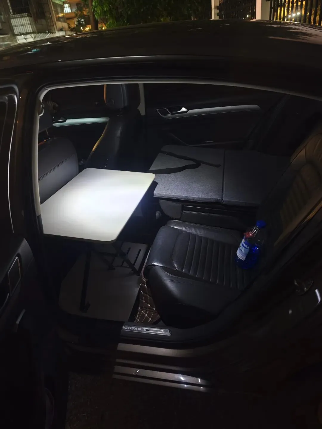 出发前翻阅了各种网上的帖子,自己把车子改造了一番。我的车子也是轿车,后排座椅放倒连通到后备箱总长度可以达到2米多m。找了一些珍珠棉泡沫垫进行找平,软硬适中,就成了一张宽度在1.1~1.4米范围的
