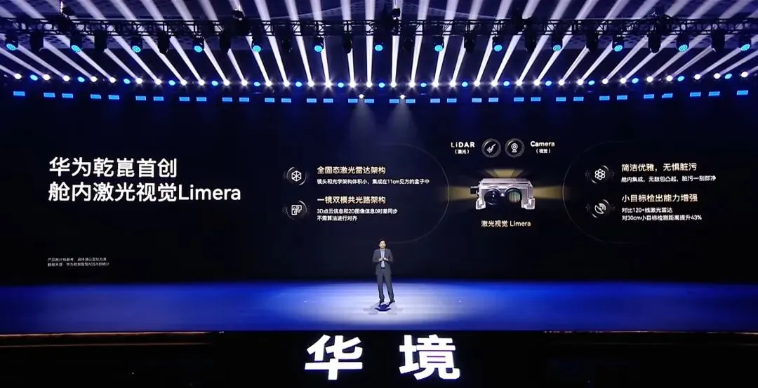 和华为绑定后,最核心卖点就是引入华为的智驾系统。受限于成本原因,华境S并没有搭载最新的896线激光雷达,甚至也没有搭载华为的ADS MAX头顶仓外激光雷达。华境S上标配的,是华为推出不久的舱内激光视觉方案Limera。
