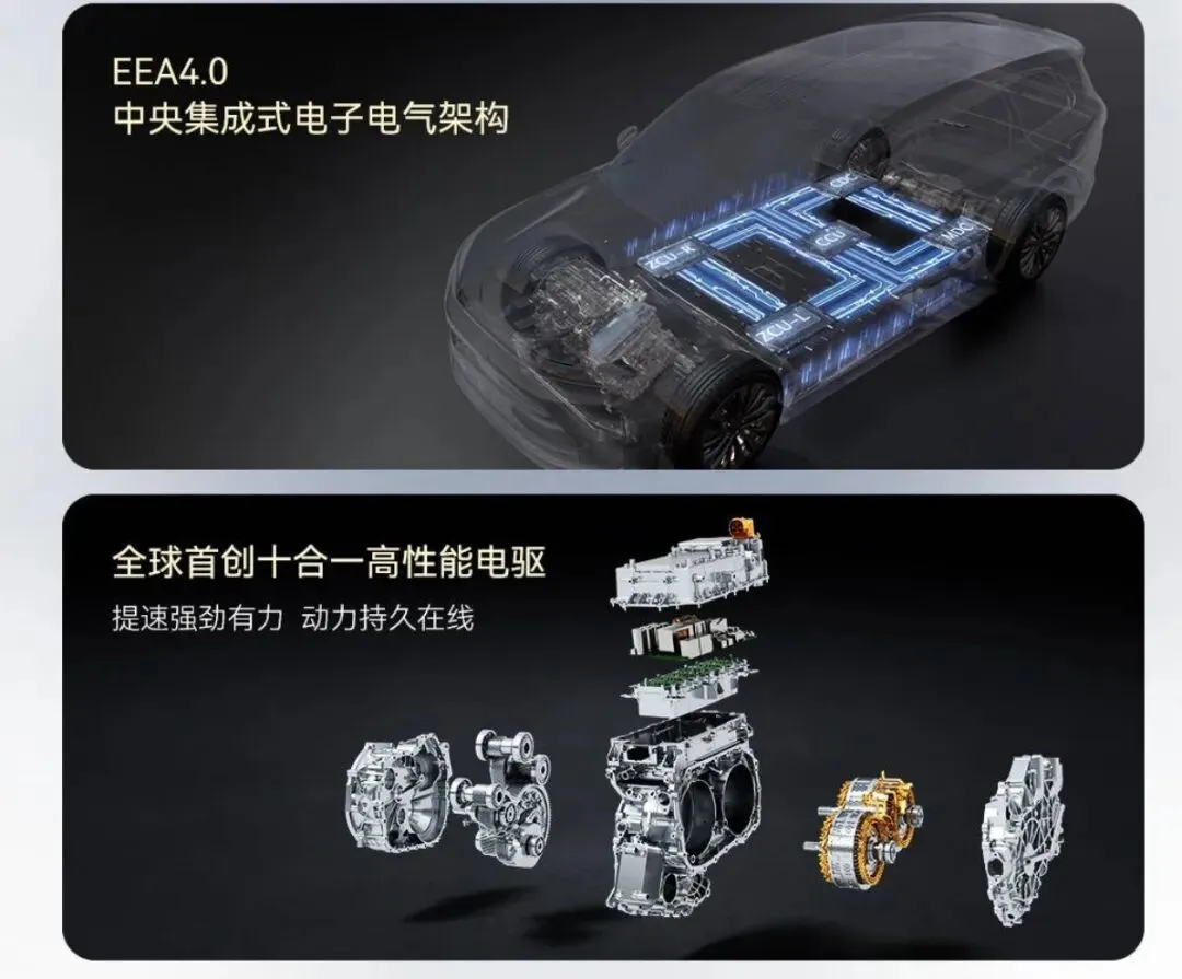 三电方面,华境S主打增程版本,采用EEA4.0平台,十合一的电驱系统,综合续航1100+km。底盘配置为前双叉臂+后多连杆,连续可变阻尼减震器,未配备空悬。