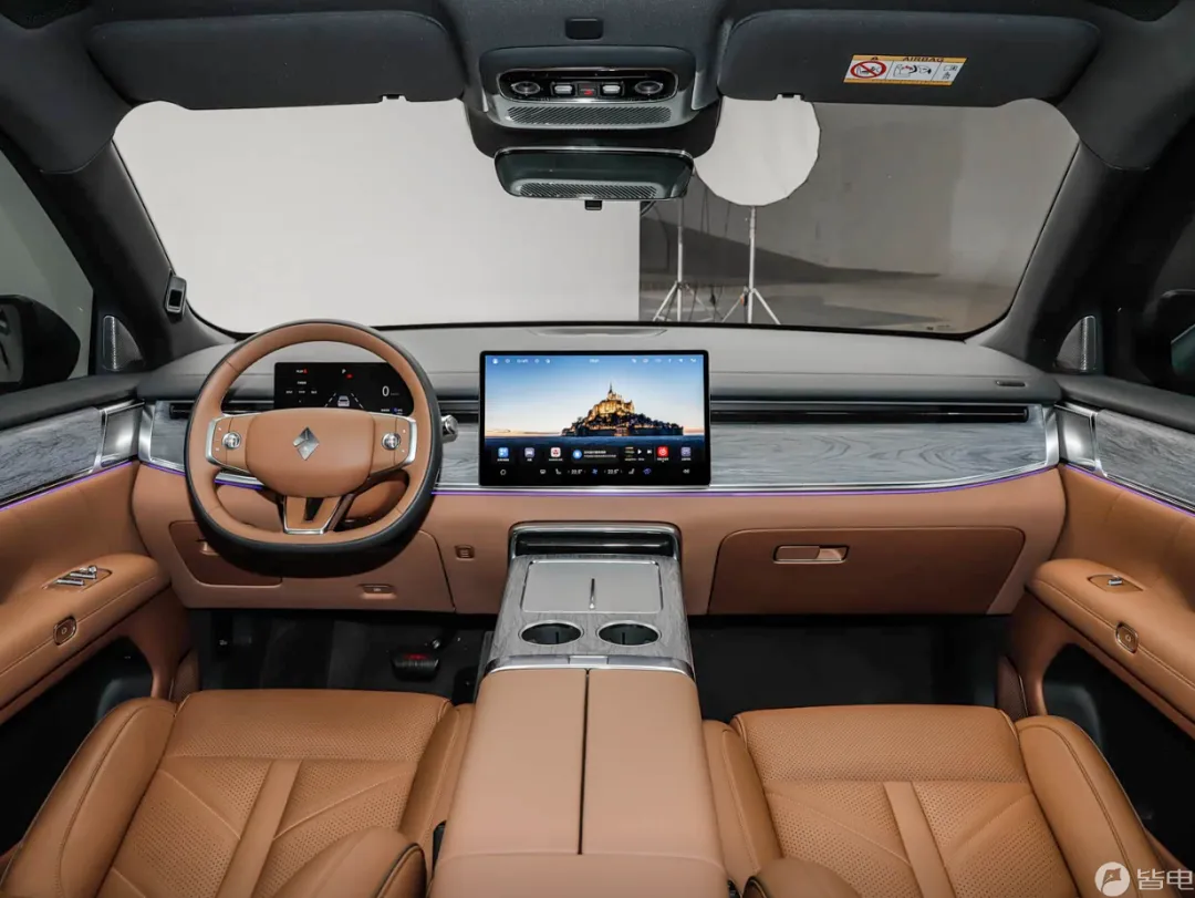 内饰方面,该车采用环抱式座舱设计,平直的中控台线条搭配全液晶仪表、悬浮式中控屏以及双拼色多功能方向盘。同时,中控岛台处配备双手机置物架。其他配置方面,该车提供后排双侧小桌板、吸顶屏以及副驾驶老板键等。此外,车辆三排放倒后备厢容积为1268L。新车提供檀香棕、象牙米两款内饰颜色。