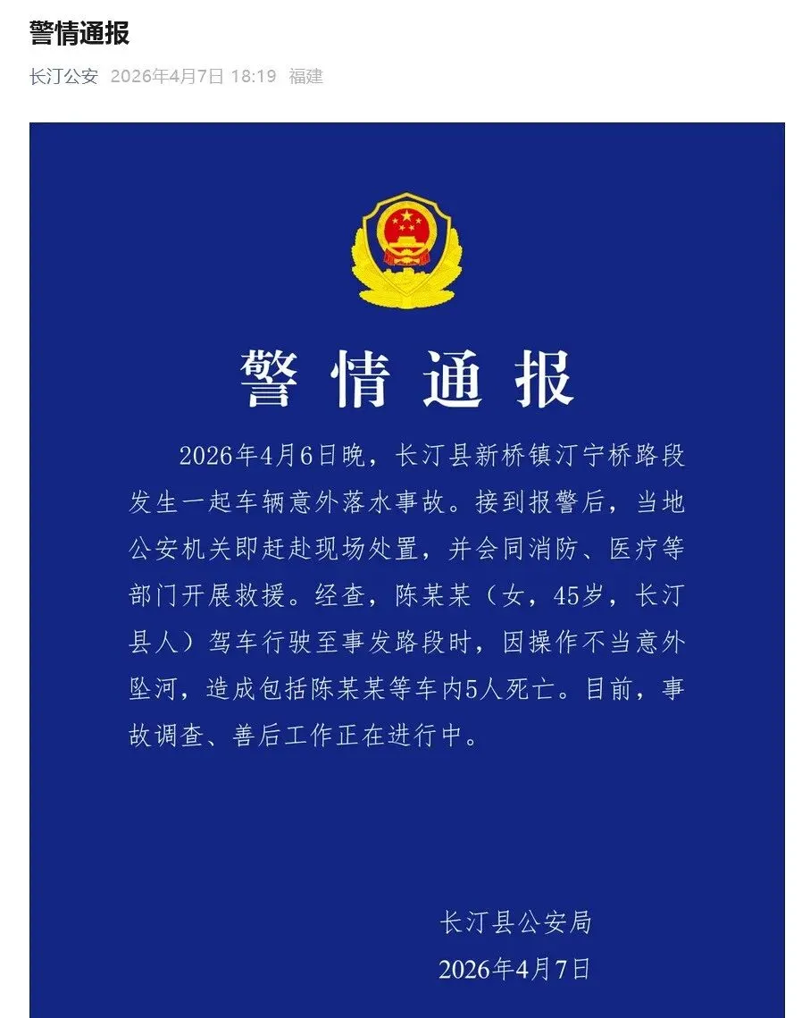 2026年4月6日晚,长汀县新桥镇汀宁桥路段发生一起车辆意外落水事故。接到报警后,当地公安机关即赶赴现场处置,并会同消防、医疗等部门开展救援。经查,陈某某(女,45岁,长汀县人)驾车行驶至事发路段时,因操作不当意外坠河,造成包括陈某某等车内5人死亡。目前,事故调查、善后工作正在进行中。