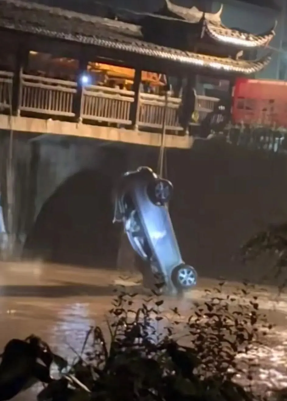 监控拍下汽车坠河瞬间画面。监控画面显示,汽车右拐后突然加速,撞毁柱子与护栏坠河。此前,长汀县气象局发布暴雨蓝色预警。目击者说,河道水流湍急,救援难度大。报警后消防、公安等部门人员陆续到场,确认车辆位置后开展救援,家属当晚也陆续到现场。打捞车辆。图源:极目新闻