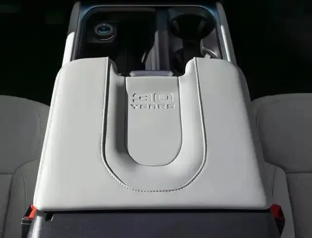 内饰换了Salt Crystal Gray,翻译过来是盐晶灰。不是那种灰扑扑的旧沙发色,是带点冷调的浅灰,缝线用深灰对比,方向盘、座椅、扶手箱都标着“30 Years”徽标。摸不到也能看见,但不突兀。我查了,这颜色名是福特设计师自己起的,不是媒体编的。