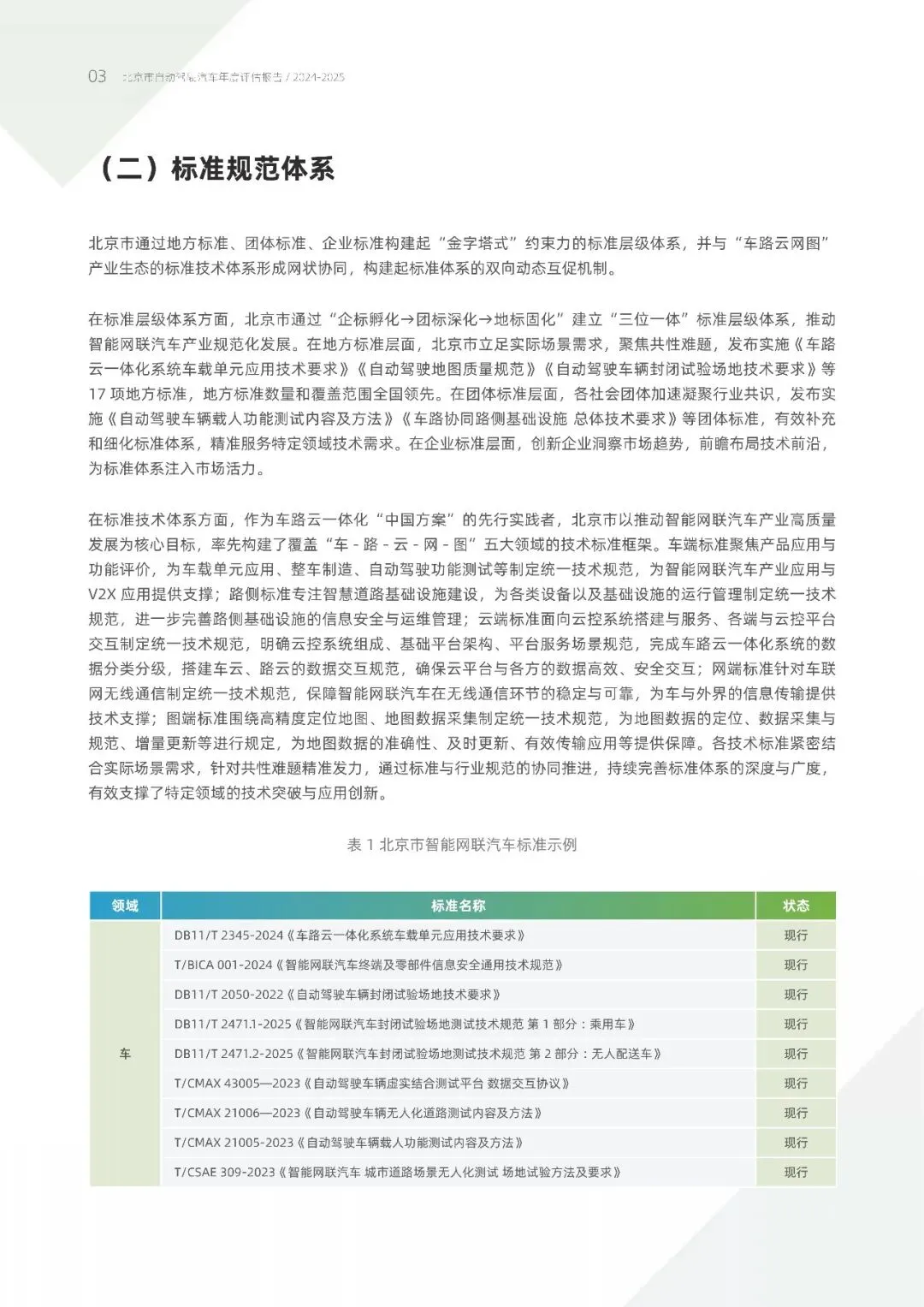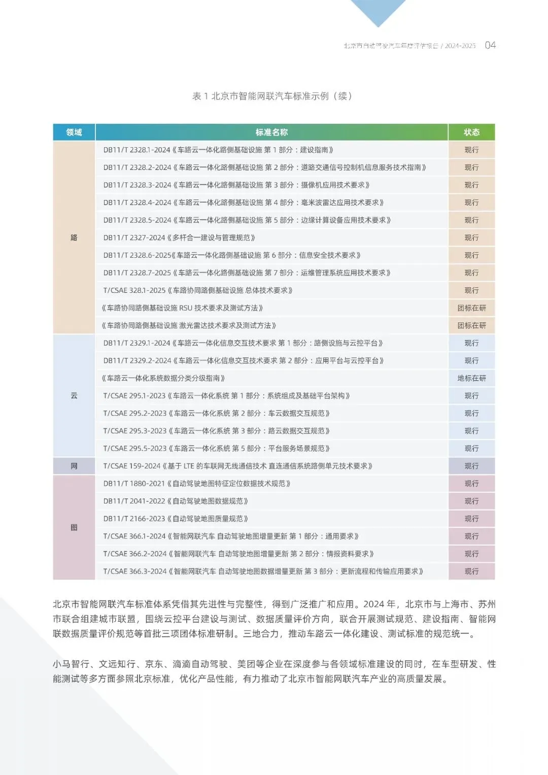 在标准层级体系方面,北京市通过"企标孵化→团标深化→地板示固化"建立"三位一体"标准层级体系,推动智能网联汽车产业规范化发展。在地方标准层面,北京市立足多实际场景需求,聚焦共性难题,发布实施《车路云一体化系统车载单元应用技术要求》《自动驾驶地图质量规范范》《自动驾驶车辆封闭试验场地技术要求》等17项地方标准,地方标准数量和覆盖范围全国领先。在团体标准层面,各社会团体加速凝聚行业共识,发布实施《自动驾驶车辆载人功能测试内容及方法》《车路协同路侧基础设施总体技术要求》等团体标准,有效补充和细化标准体系,精准服务特定领域技术需求。在企业标准层面,,创新企业洞察市场趋势,前瞻布局技术前沿,为标准体系注入市场活力。