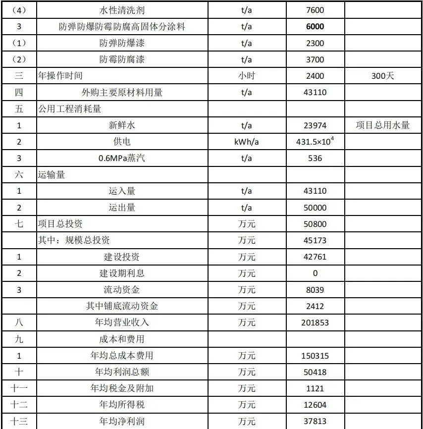 该项目占地面积53335.5平方米,设计低VOCs环境友好型专用涂料2.4万吨/年,其中:清漆5800吨/年、固化剂2400吨/年、稀释剂5200吨/年、金属漆2100吨/年、实色漆3200吨/年,底漆5300吨/年。水性汽车专用涂料2万吨/年,其中:水性底漆4800吨/年,水性金属漆3600吨/年,水性实色漆4000吨/年,7600吨/年水性清洗剂。防弹防爆防霉防腐高固体分涂料0.6万吨/年(防弹防爆漆2300吨/年、防霉防腐漆3700吨/年)。