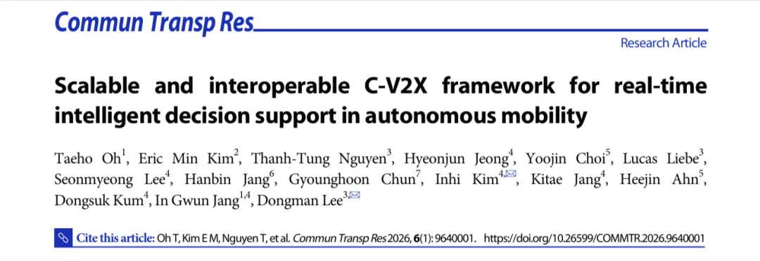 Oh T, Kim EM, Nguyen T-T, et al. Scalable and interoperable C-V2X framework for real-time intelligent decision support in autonomous mobility. Communications in Transportation Research, 2026, 6(1): 9640001. https://doi.org/10.26599/COMMTR.2026.9640001