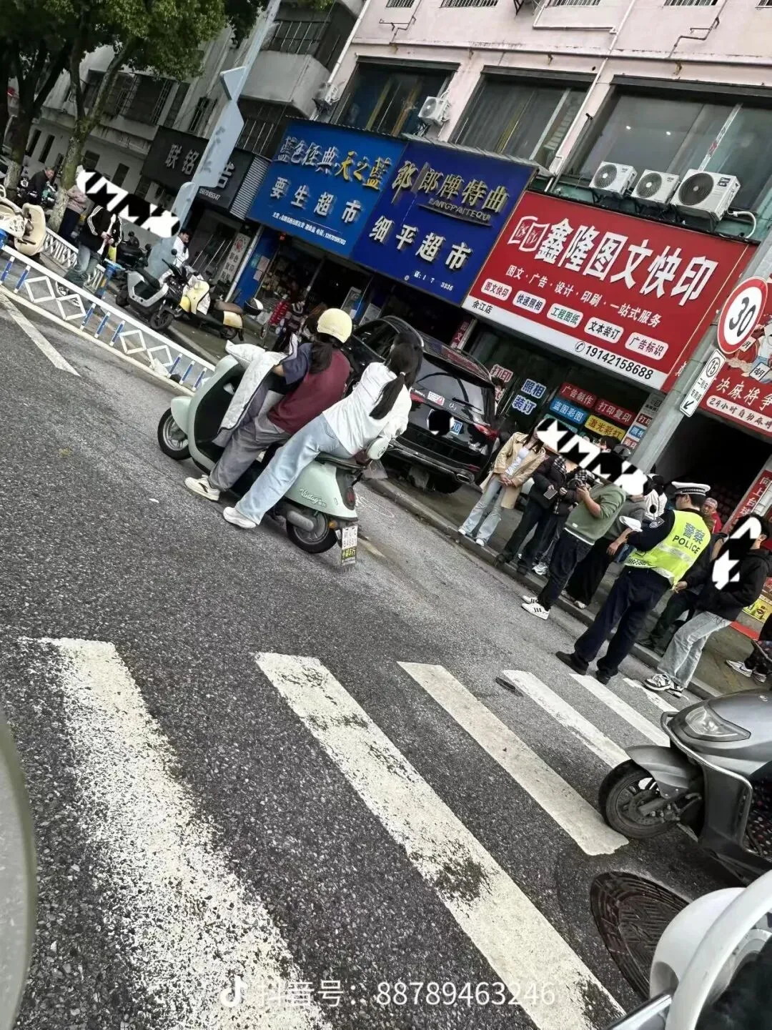 🛵 安全隐患:画面左侧的斑马线上,有两名年轻人同乘一辆电动车,其中后排的人不仅没有佩戴安全头盔,还做出了“侧坐”或“翘腿”的危险动作。这种姿势在骑行中极不稳定,极易发生摔倒。