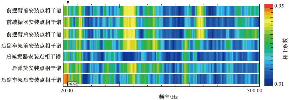 第二,确定后悬架传递的通道。这辆车后悬架与车身的连接点有前摆臂前安装点、前减振器安装点、前摆臂后安装点、后副车架前安装点、后弹簧安装点、后减振器安装点、后副车架后安装点。分析车内噪声与这些连接点振动之间的相干函数,如图