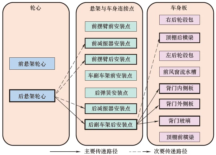 给出了车内噪声与车身板(右后轮毂包、顶棚后横梁、左后轮毂包、前风窗流水槽、背门内侧板、背门外侧板、