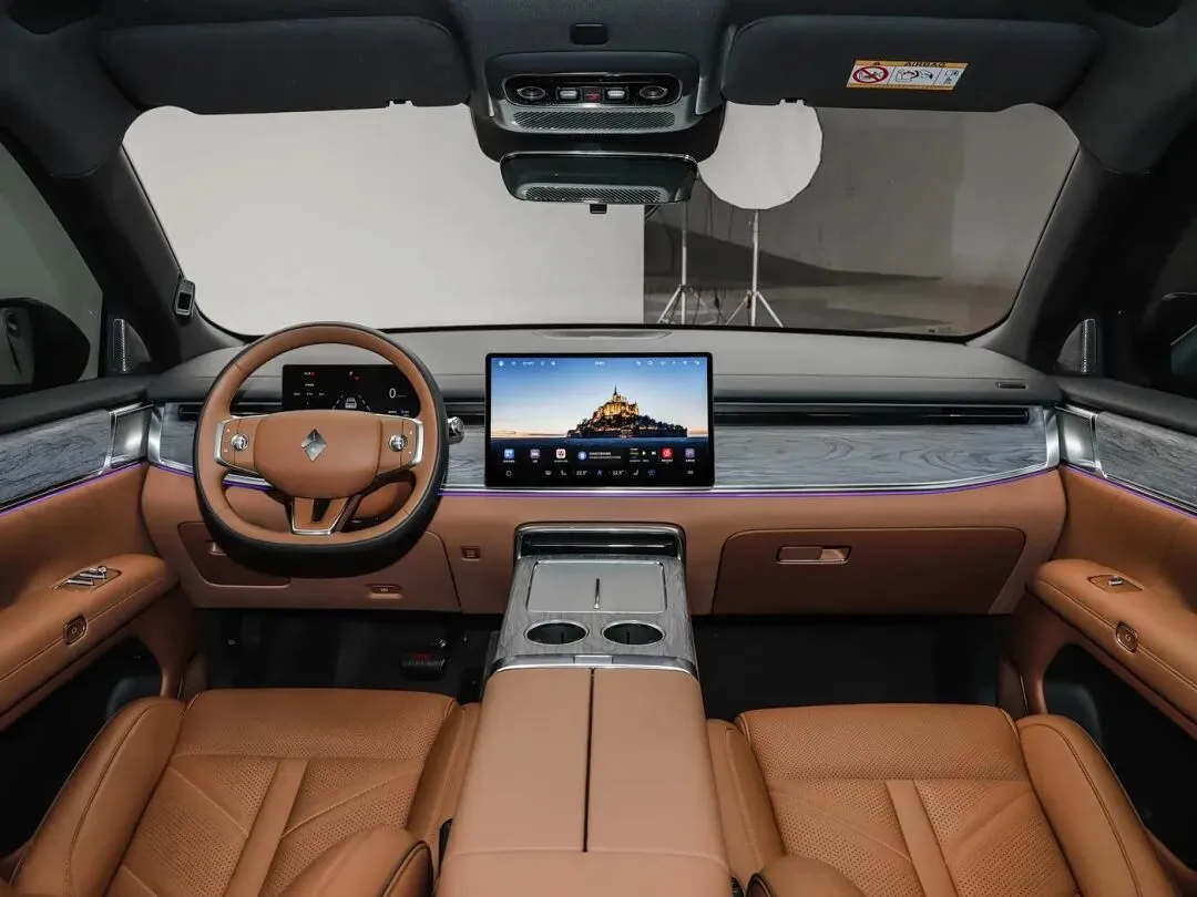 内饰方面,环抱式设计看着极上档次,再加上15.6英寸AMOLED悬浮式中控屏、车载冰箱等配置,科技感也到位了。
