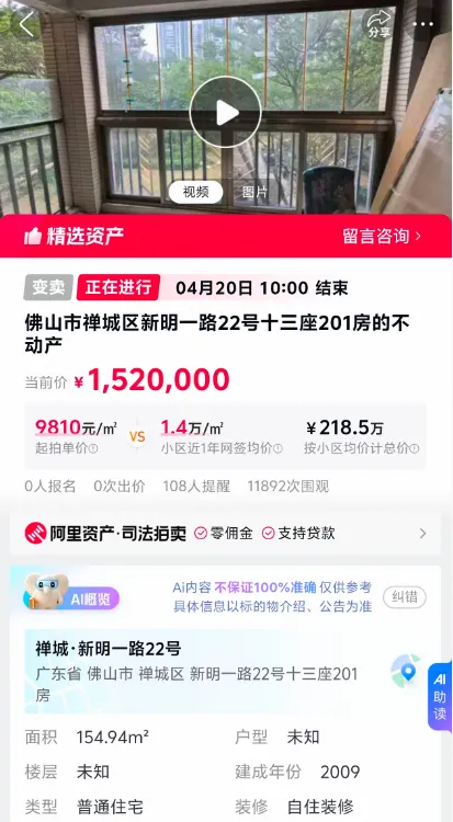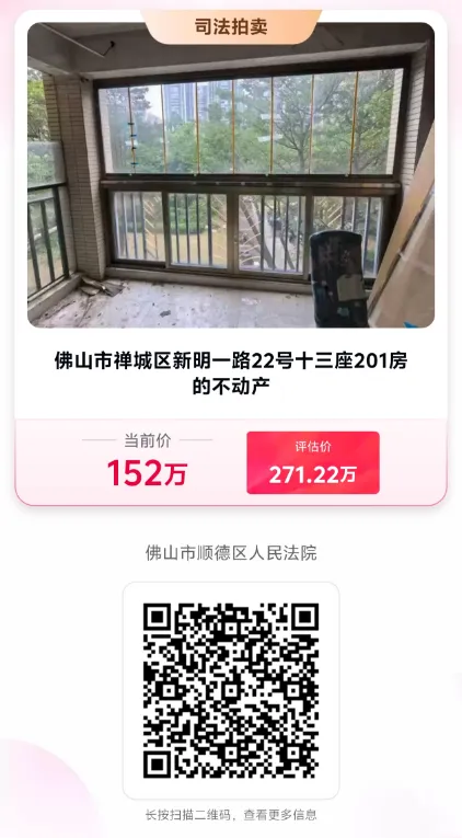 位于佛山市禅城区新明一路22号十三座201房的不动产,建筑面积154.94平方米,套内建筑面积127.27平方米,起拍价人民币1520000元。