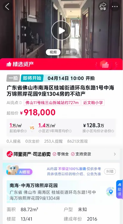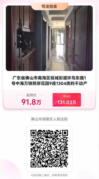 位于广东省佛山市南海区桂城街道环岛东路1号中海万锦熙岸花园9座1304房的不动产,建筑面积88.72平方米,套内建筑面积69.31平方米,起拍价人民币918000元。