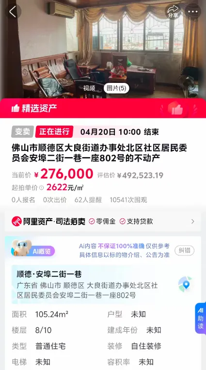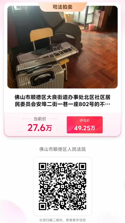 位于佛山市顺德区大良街道办事处北区社区居民委员会安埠二街一巷一座802号的不动产。现编地址:广东省佛山市顺德区大良街道北区社区环市北路53号1栋1单元802房。建筑面积105.24平方米,套内建筑面积90.15平方米(含杂物间建筑面积约6.1平方米),起拍价人民币276000元。