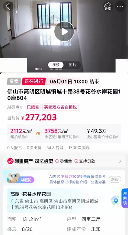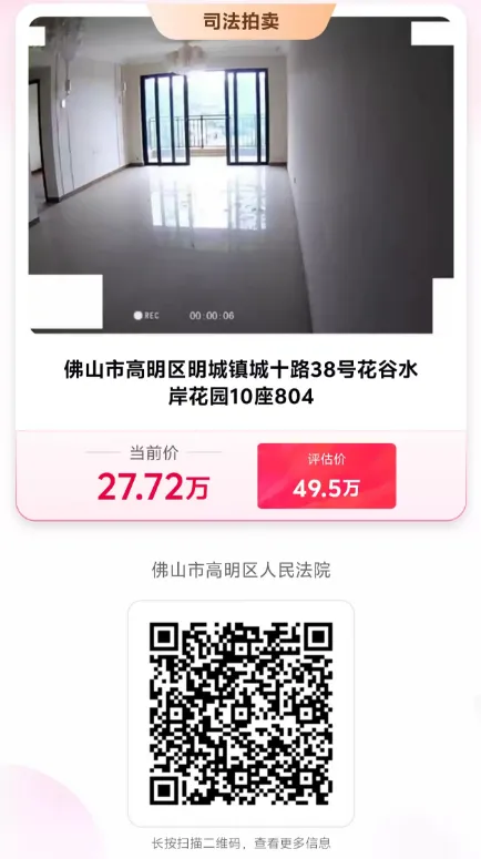 位于佛山市高明区明城镇城十路38号花谷水岸花园10座804,建筑面积131.21平方米,起拍价人民币277203元。