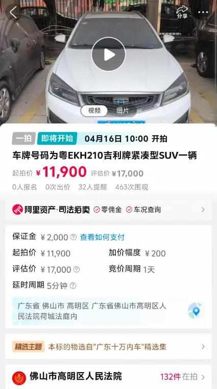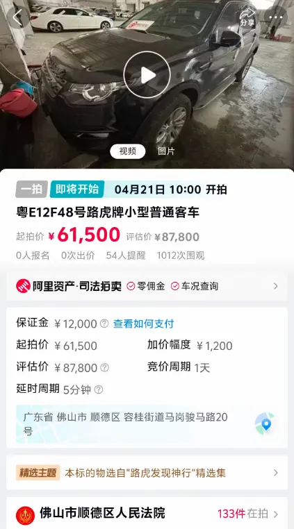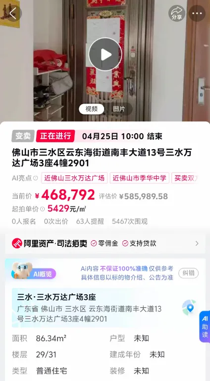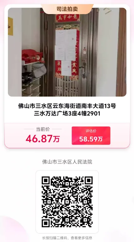 位于佛山市三水区云东海街道南丰大道13号三水万达广场3座4幢2901,房屋建筑面积86.34平方米,起拍价人民币468792元。