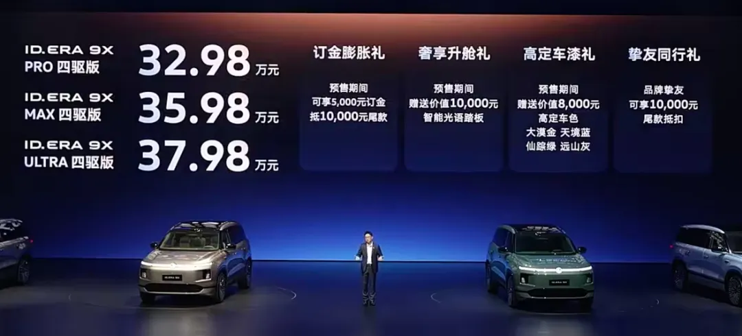 从目前已知信息来看,ID.ERA 9X将推出3款车型可选,预售价区间为32.98-37.98万元。作为一款大型SUV,这个售价没什么毛病,比起很多同级新势力还要便宜,若是再考虑预售权益以及正式售价会降低,新车未来也就是竞争30-35万新能源SUV市场,属于“9系打8系”。但话说回来,这个价位区间的国产新能源实力可都不一般,想要赢得用户认可,在大众光环已经逐渐淡出的当下还得拿出点真本事,接下来咱们就聊聊新车都有哪些亮点。