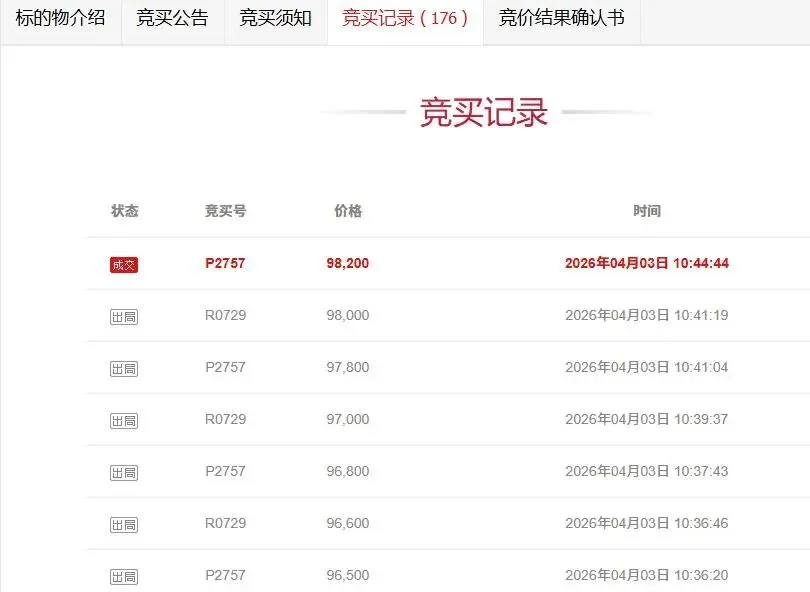 此次拍卖,是这辆丰田皇冠第一次拍卖,起拍价为5.53万元,拍卖开始后,吸引了多达14个人报名参与竞拍,竞拍人数还是非常多的。最终经过多达176次加价竞拍才结束竞拍,车辆最后以9.82万元高价成交,成交价比起拍价高出了4.29万元。