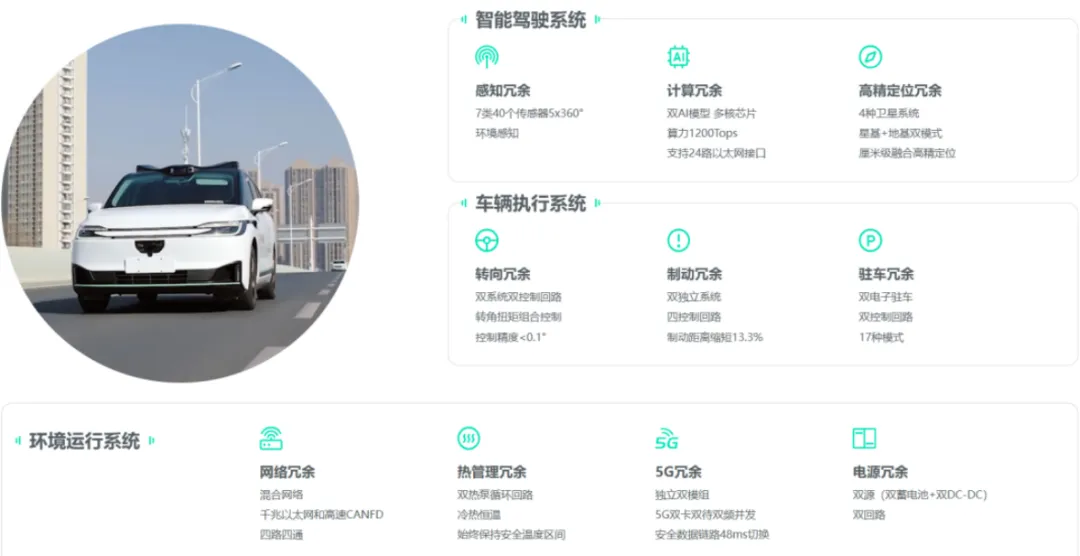 按萝卜快跑客服回应所称,此次系统异常是由网络原因导致的,那么,根据官网数据显示,在网络冗余方面,萝卜快跑在网冗余方面是“混合网络、千兆以太网和高速CANFD、四路四通”。