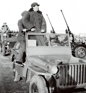 1949年,毛主席乘坐美式吉普车检阅高炮部队。