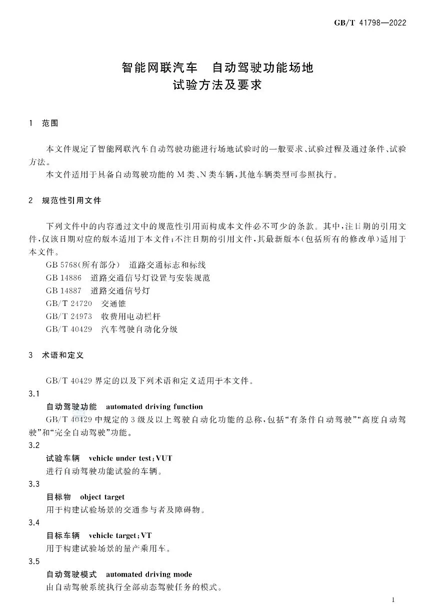 >[汽车法规]智能网联汽车 自动驾驶功能场地试验方法及要求