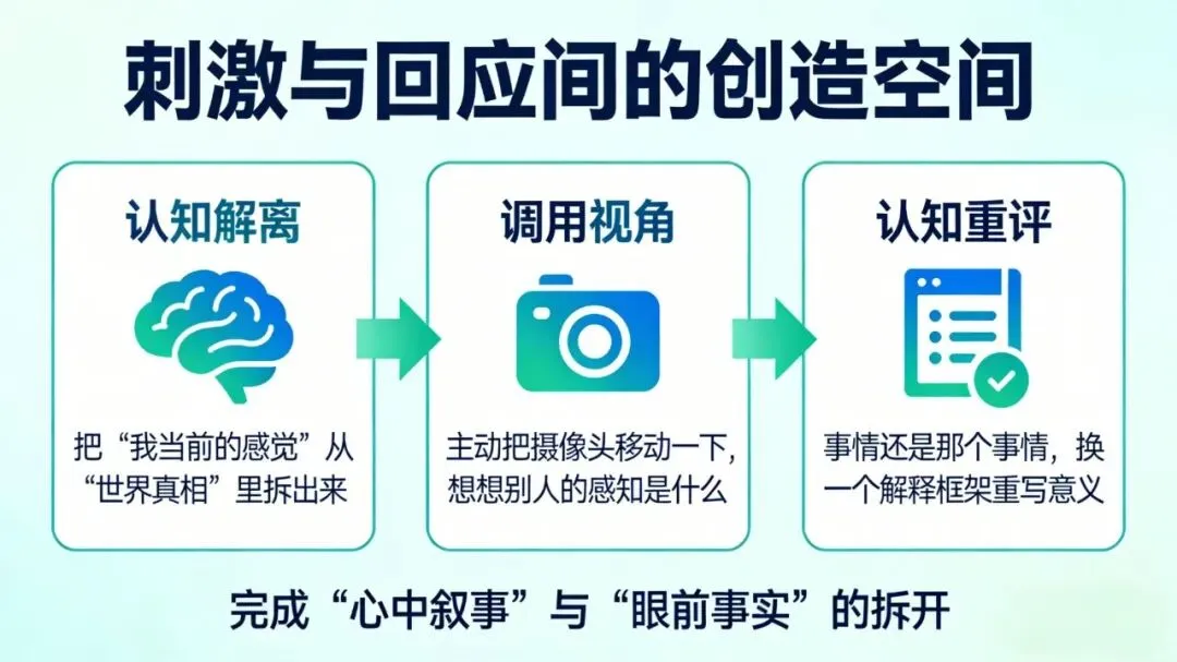 核心观点:认知解耦不是消灭情绪,而是分离情绪与自我,用三步程序把被动反应变成主动选择,为后续认知重构铺路。
