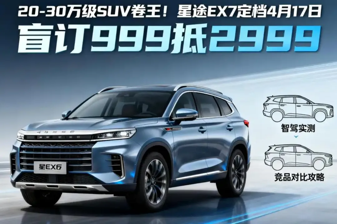 4 月 3 日,星途官方宣布,品牌 3.0 时代首款车型星途 EX7 将于 4 月 17 日正式上市,新车定位 20-30 万级性能豪华大五座中大型 SUV,主打双动力、强底盘、高智能、超舒适,以百万级硬件对标主流新能源市场。目前新车已开启盲订,999 元订金可抵 2999 元,还可限时免费升级车载冰箱,上市后将进一步丰富中大型新能源 SUV 市场选择。