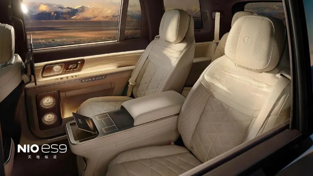 空间和座椅,才是ES9的“杀手锏”。车身尺寸直接飙到5365mm,轴距3250mm,比ES8大一圈,采用2+2+2座椅布局,第二排“老板座”直接封神——零重力功能拉满,支持大角度躺卧,还有通风、加热、多模式按摩,甚至连足底按摩都有,20向电动调节+一体式腿托,坐上去比家里的沙发还舒服,堪称“移动头等舱”。