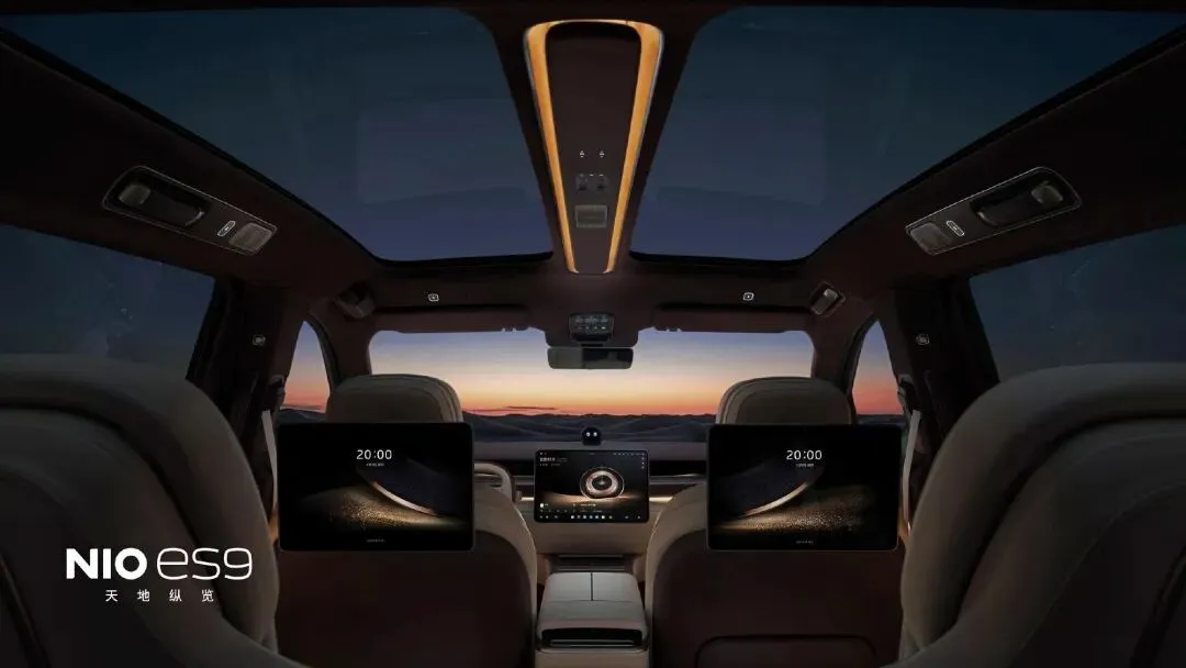 内饰方面,蔚来走的是“稳扎稳打”路线,没有搞花里胡哨的设计,整体风格和其他车型差不多,但胜在空间够大、用料够狠。Nappa真皮、枫影真木随便用,座椅靠背和车门饰板上还有艺术感十足的刺绣,氛围感直接拉满。全景天窗被纵向中央控制台分成两半,仿飞机客舱的设计很有格调,第二排独立14.5寸娱乐屏+中央8寸触控屏,侧窗还能调节透光度,标配30个扬声器,听歌堪比小型影院。