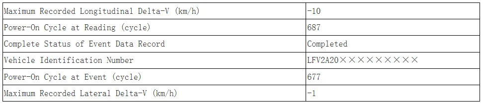 利用CDR(CRASH DATA RETRIEVAL SYSTEM)读取被鉴定车辆安全气囊模块中记录的数据,部分数据如下: