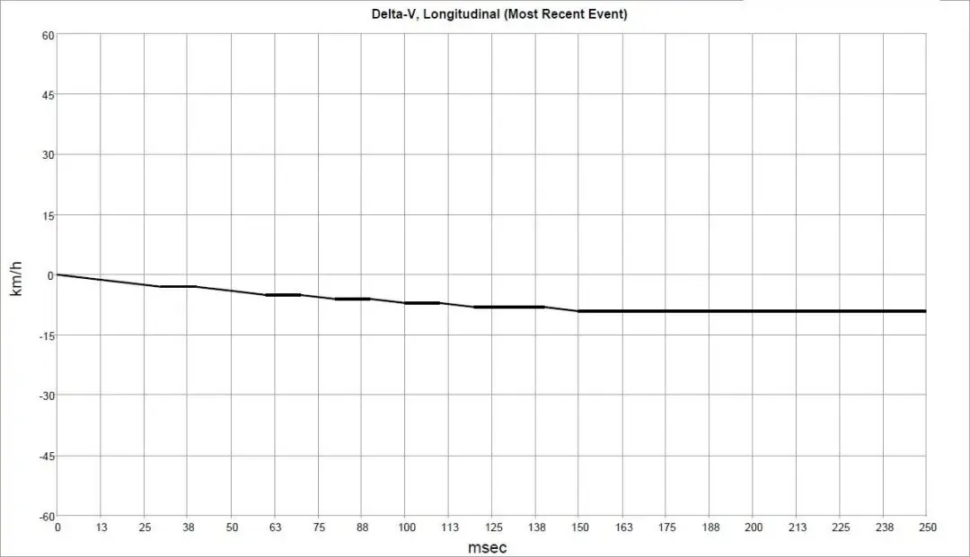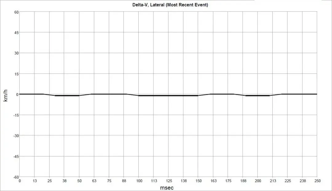 被鉴定车辆安全气囊模块记录数据示,该车安全气囊模块中记录了1个事件,该事件触发记录时的点火次数为677,该事件记录的最大纵向速度变化值为-10km/h,其纵向速度变化曲线如图3所示,该事件记录的最大横向速度变化值为-1km/h,其横向速度变化曲线如图4所示。