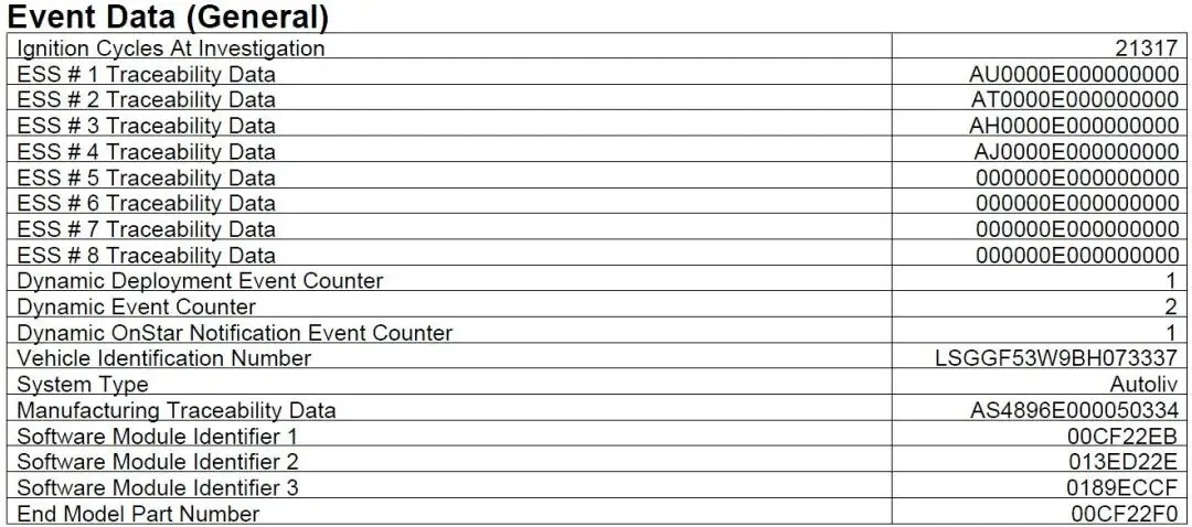 被鉴定车辆安全气囊模块记录共读取到2个事件记录。其中,事件记录1的碰撞时点火循环为23,该数据示驾驶员安全气囊及前排乘员安全气囊未点爆;事件记录2的碰撞时点火循环为21316,该数据示驾驶员安全气囊及前排乘员安全气囊点爆。本次数据读取时的点火循环为21317,结合该车检验情况(如驾驶员安全气囊及前排乘员安全气囊点爆)分析,该车安全气囊模块中事件记录2的数据为本次事故的数据。