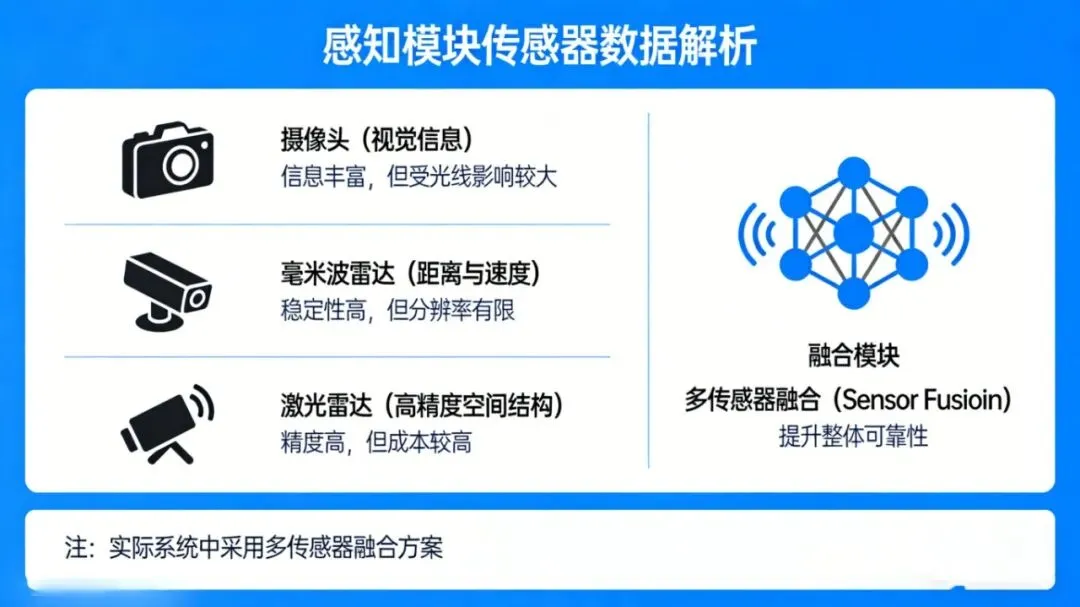 感知模块依赖多种传感器数据,常见包括: