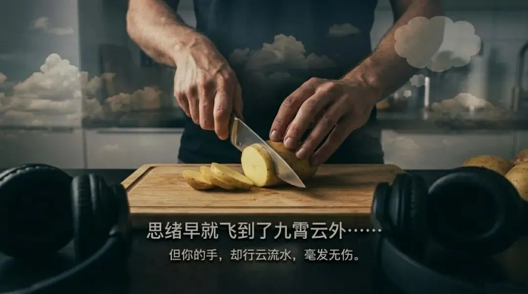 又或者,你一边听着播客一边切菜做饭,脑子早就飞到了九霄云外,但你的手却能行云流水地把土豆切得整整齐齐,连手指头都没破一点皮。