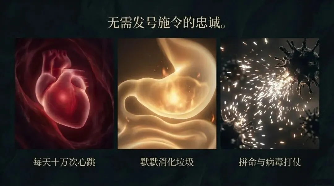 只要你的意识一掉线,它就会忠诚地开启“自动驾驶”模式。它不需要你用意念去发号施令,你的心脏每天为你跳动十万次,你的肠胃默默帮你消化那些垃圾食品,你的白细胞在你看不见的地方为你拼命和病毒打仗。