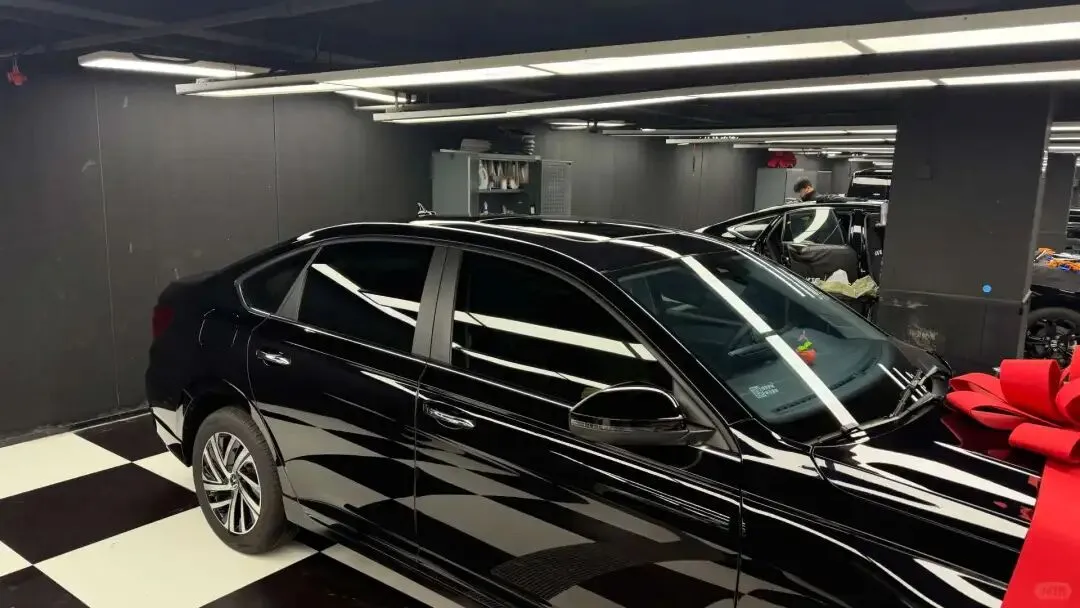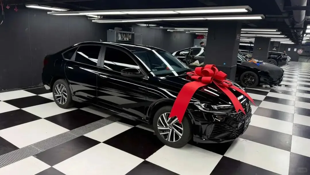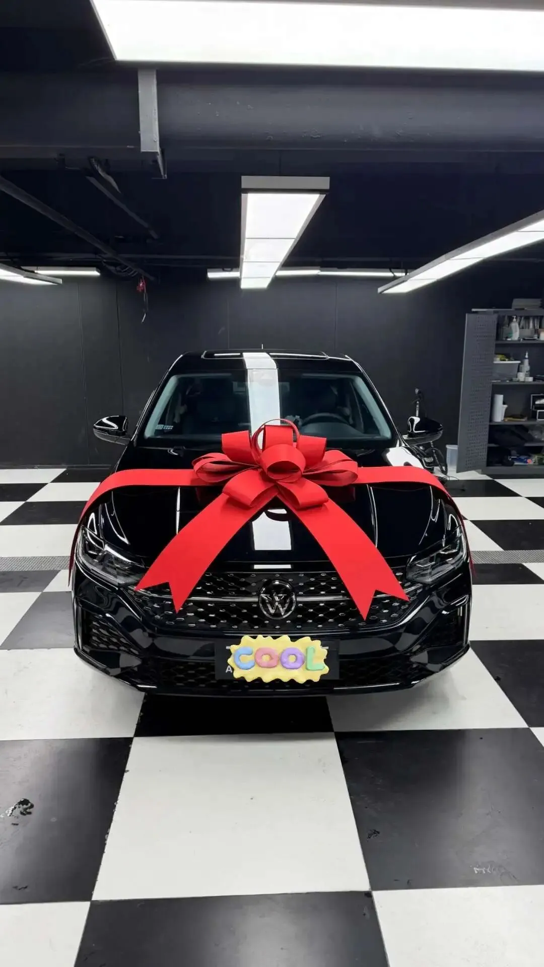 大众味很重,车标、前脸比例以及灯组都很熟悉。黑色的漆面使得车身更加沉稳,并且搭配上大红蝴蝶结之后整车就有一种从日常代步变成交付仪式感的感觉了。💡如果送车或者提新车的话,视觉冲击力很强,拍照效果也很好。