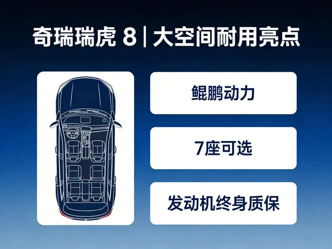 10 万级想找大空间、耐造的,瑞虎 8 真的绕不开。这个价位想找台能拉人又能拉货、还特省心的 SUV,瑞虎 8 绝对是首选!发动机终身质保这块,真的太让人安心了,家用闭眼入不亏!瑞虎 8 是 10 万级中型 SUV 的务实之选,主打大空间、高性价比、用车省心。鲲鹏 1.6T/2.0T 动力成熟,油耗友好,变速箱换挡平顺,长期开稳定性拉满。5 座宽敞舒适,7 座可应急使用,二胎家庭、多口之家出行都能适配。保养便宜、维修网点多,再加上发动机终身质保,长期用车毫无后顾之忧。内饰虽然是塑料为主,但胜在耐造好打理,小孩踩脏了一擦就干净。中控屏操作简单,爸妈也能轻松上手,不像有些车机花里胡哨还不好用。空间同价位无敌 , 家用太实用。