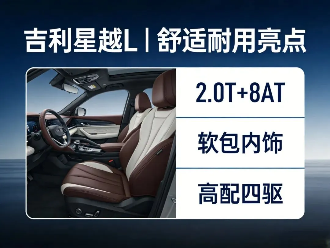 15 万级能做到这种质感,星越 L 确实有点东西。内饰真的长脸,全是软皮包着,翻毛皮座椅摸着巨舒服,看着就不像十几万的车,亲戚朋友坐上来都觉得很高级。15 万级想舒服又耐用,这款闭眼冲,配置多到用不完星越 L 在 15 万级里,属于配置、质感、耐用性三不误的车型。三大件靠谱,内饰用料好,坐着舒服,开着顺手,家用代步、长途都很合适。全系 2.0T + 爱信 8AT,动力平顺,不会有小马拉大车的感觉,高配还有四驱,雨雪天更稳。轴距够长,后排宽敞,座椅舒适性不错,长时间开车不累,家用很友好。车机流畅、智驾够用,音响、屏幕这些配置都拉满,日常用车体验很好。保值率和维修成本在国产里算优秀,正常保养,十年基本不用操心大修。也有小问题,底盘偏硬,过减速带、坑洼路有点颠,坐后排的人会觉得有点晃。油耗市区略高一点,但整体能接受