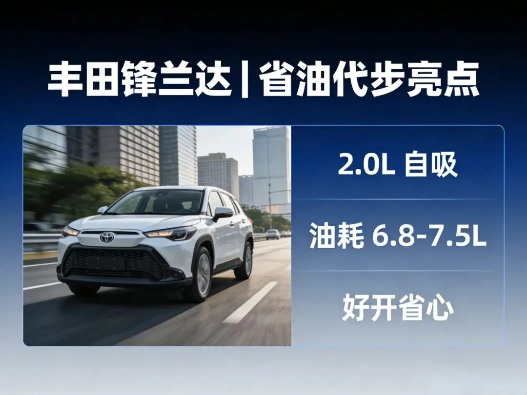 市区代步想省油、不想操心,锋兰达真的太合适。市区代步是真的省,堵车也就 6 个多油,加 92 号油就行,每月油费几百块搞定,通勤代步完全没压力。车身小巧好停车,小区狭窄车位、商场地下车库,一把就能倒进去,新手女司机也能轻松开锋兰达是丰田经典家用 SUV,核心优势就是省油、耐造、几乎无小毛病。2.0L 自吸 + CVT 动力组合,平顺好开,市区代步油耗低至 6.8-7.5L/100km。车身小巧灵活,停车变道轻松,特别适合日常上下班、买菜接娃。全系安全配置拉满,保养便宜,用车成本极低,开十年只需要正常保养。没有花里胡哨的智能配置,都是扎实可靠机械素质。除了省油就是省心 ,动力是真肉,起步慢,高速超车得提前踩油门,追求推背感的直接劝退。实在是太适合不喜欢瞎折腾的人了!